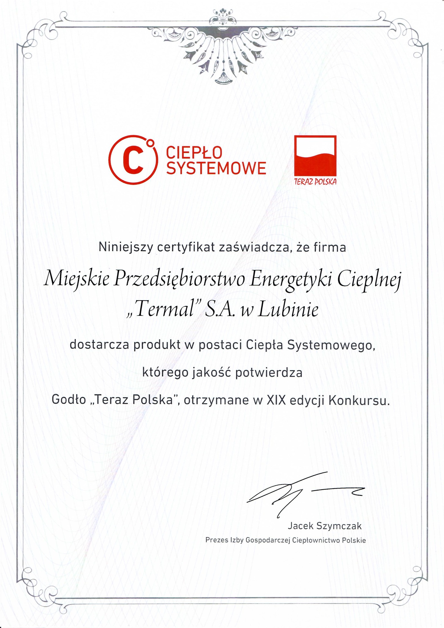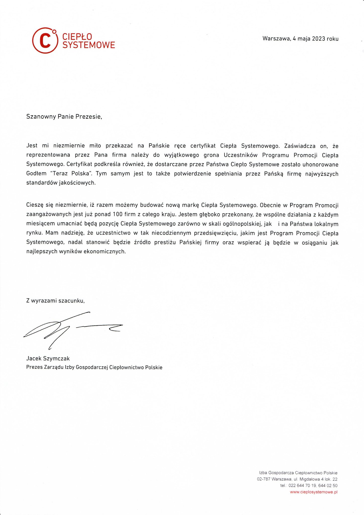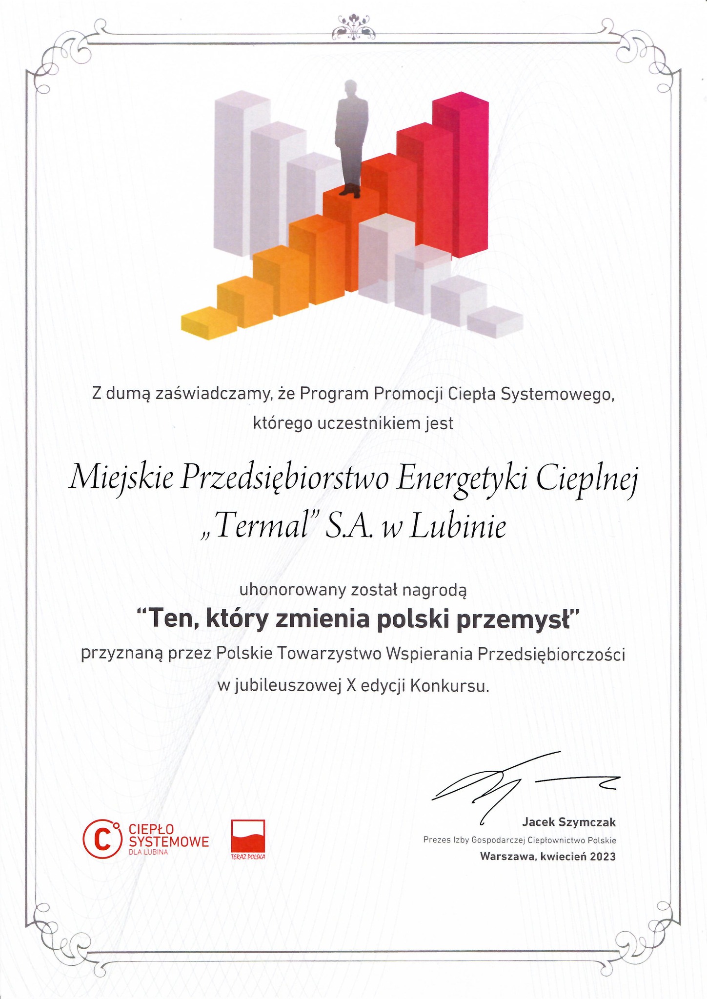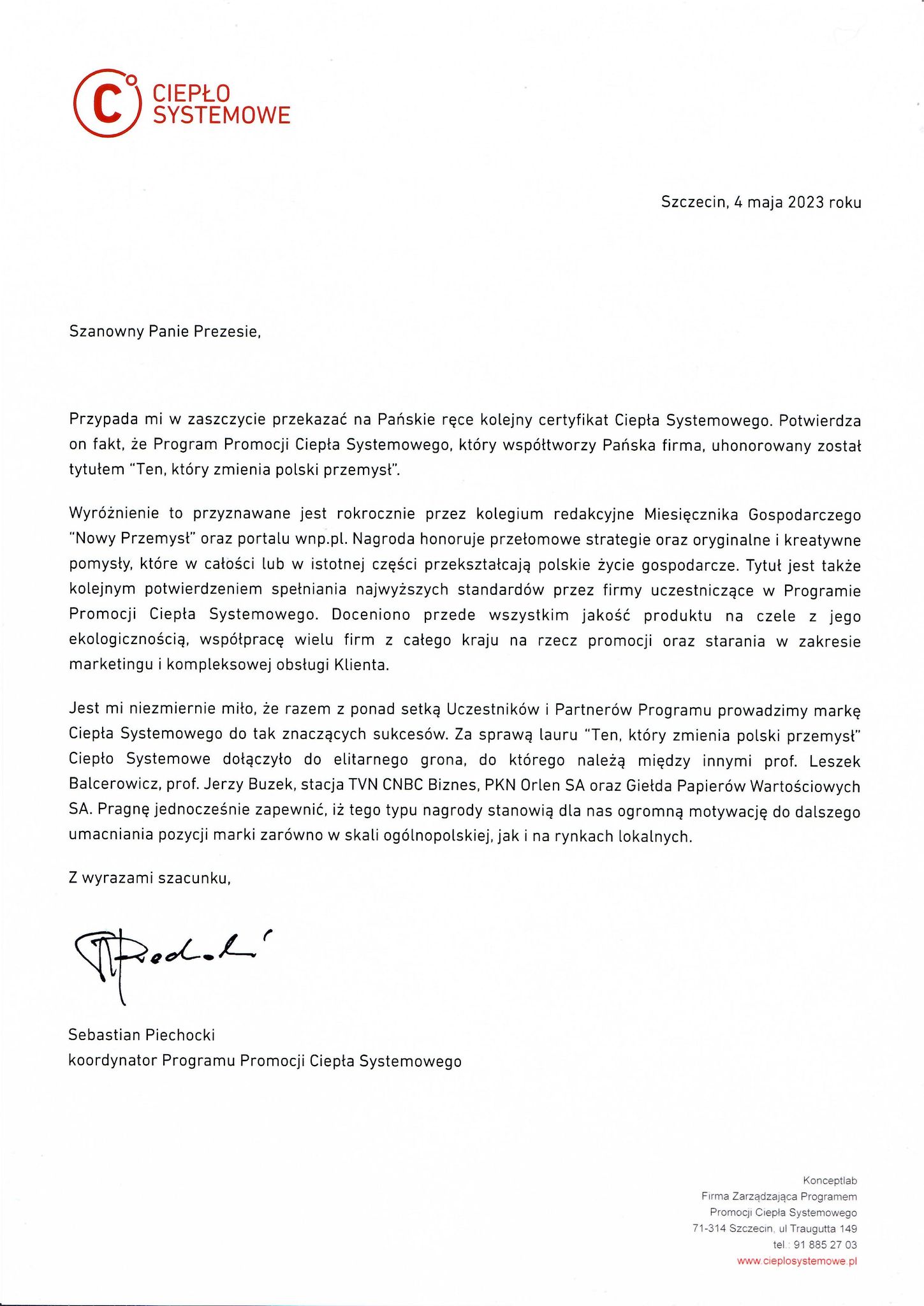 Jako uczestnik programu CIEPŁO SYSTEMOWE otrzymaliśmy certyfikat „Ten, który zmienia polski przemysł”
